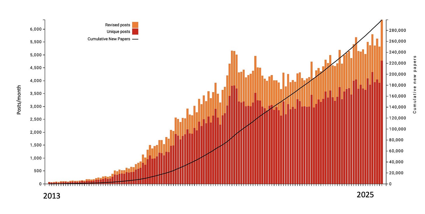 Crucially for computer science, these repositories handle *a lot* of volume, with arχiv now receiving more than 20,000 submissions per month. Indeed, the volume of research is all but crippling regular peer review in subfields like machine learning.1
